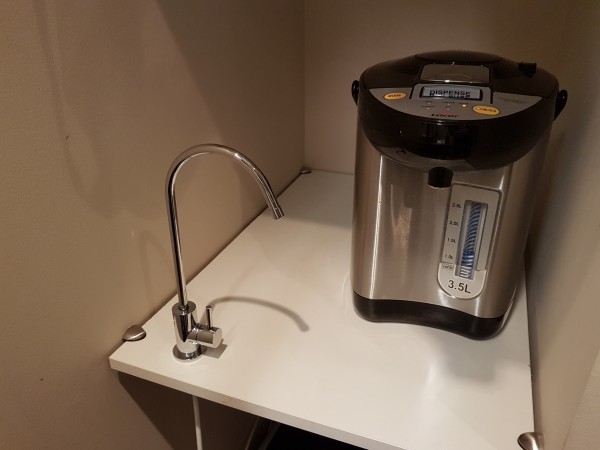 У меня в кабинете есть ванная комната. Там и установлены осмос и термопот.