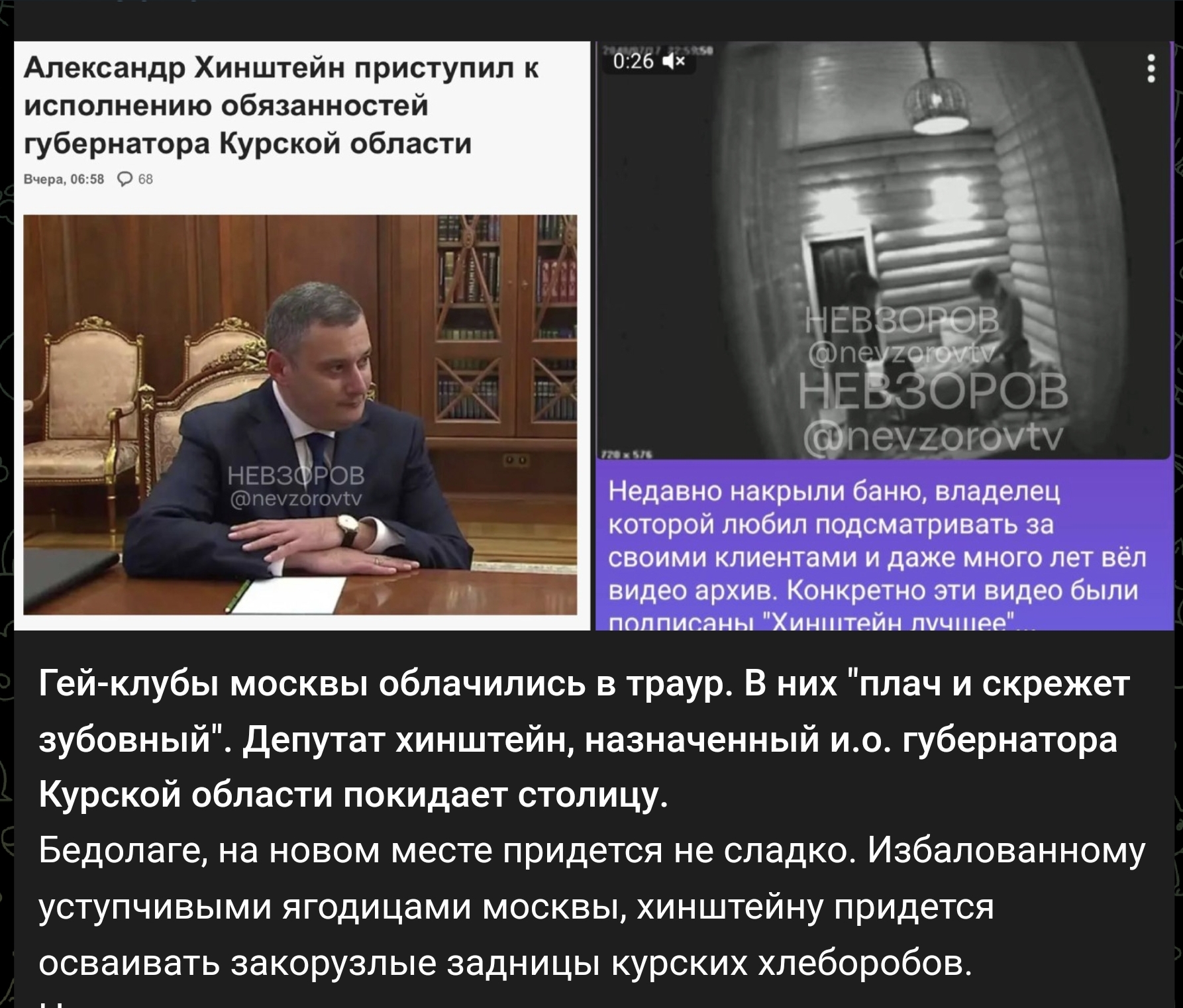 "Хинштейн, похоже, так ох#ел от своего назначения и.о. губернатора Курской области, что не нашел в себе слов, чтоб написать об этом что-нибудь в своем телеграм-канале.