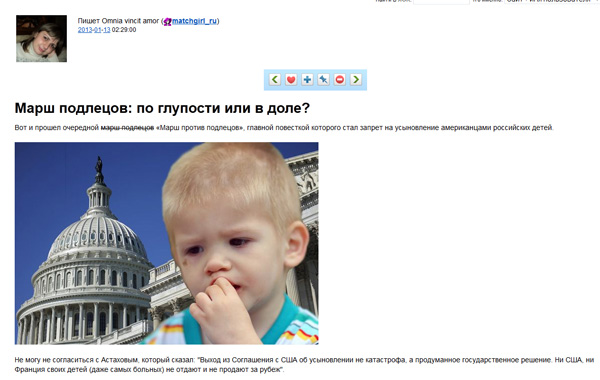 "Вот и пройдет очередной марш подлецов «Марш против подлецов», главной повесткой которого стал запрет на усыновление американцами российских детей."