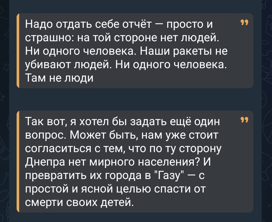 Недавно было смешное - когда кто-то из Z-блогеров назвал украинцев людьми второго сорта. Из его "коллег" возмутились только предатели Украины типа уроженца Украины Подоляки. Остальные блогеры, наверное, подумали - "ачотакова, все правильно назвал".