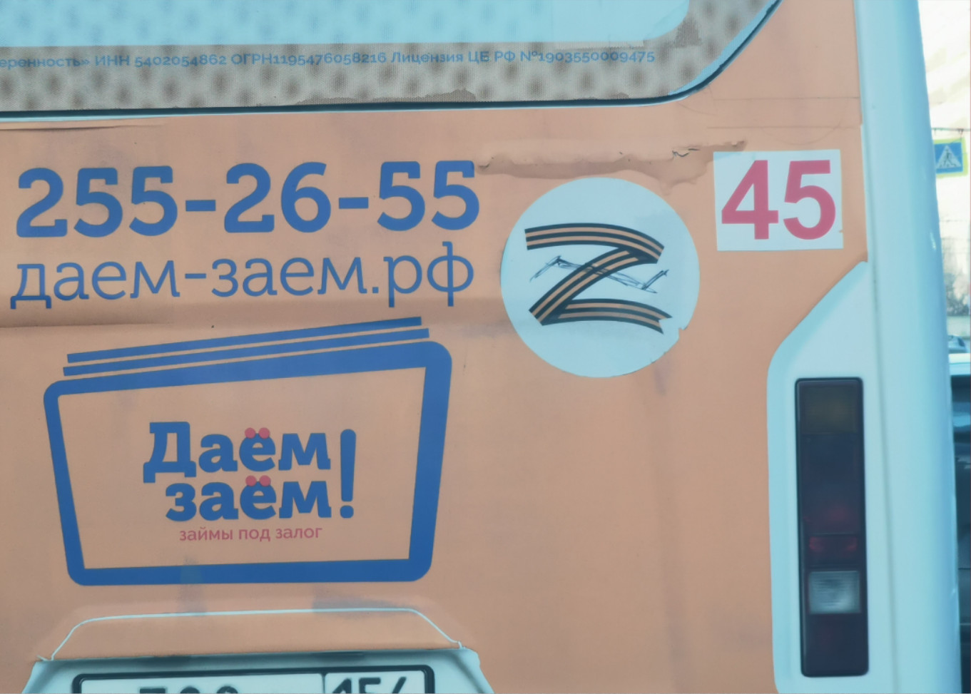 Во Владивостоке немало машин частных с этим знаком. На автобусах муниципальных. Периодически вывешивают биллборды с фото "героев". Сейчас новая волна вывешиваний "героев Приморья". Ну это кроме повсеместных призывов "присоединяться к армии победителей" и к своим, конечно.