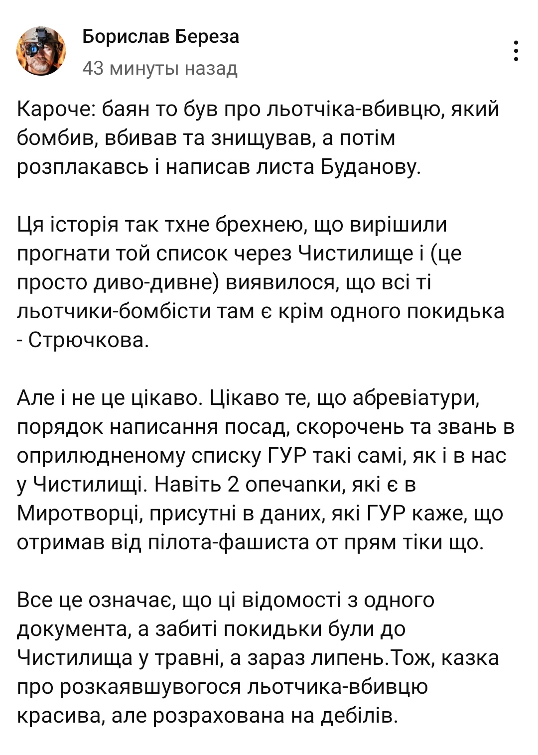 Если кратко, то Борислав Береза этому не верит. Мол, в Миротворце есть все эти летчики, кроме главного героя, плюс специфические опечатки одинаковы что в переданных доках, что в базе.