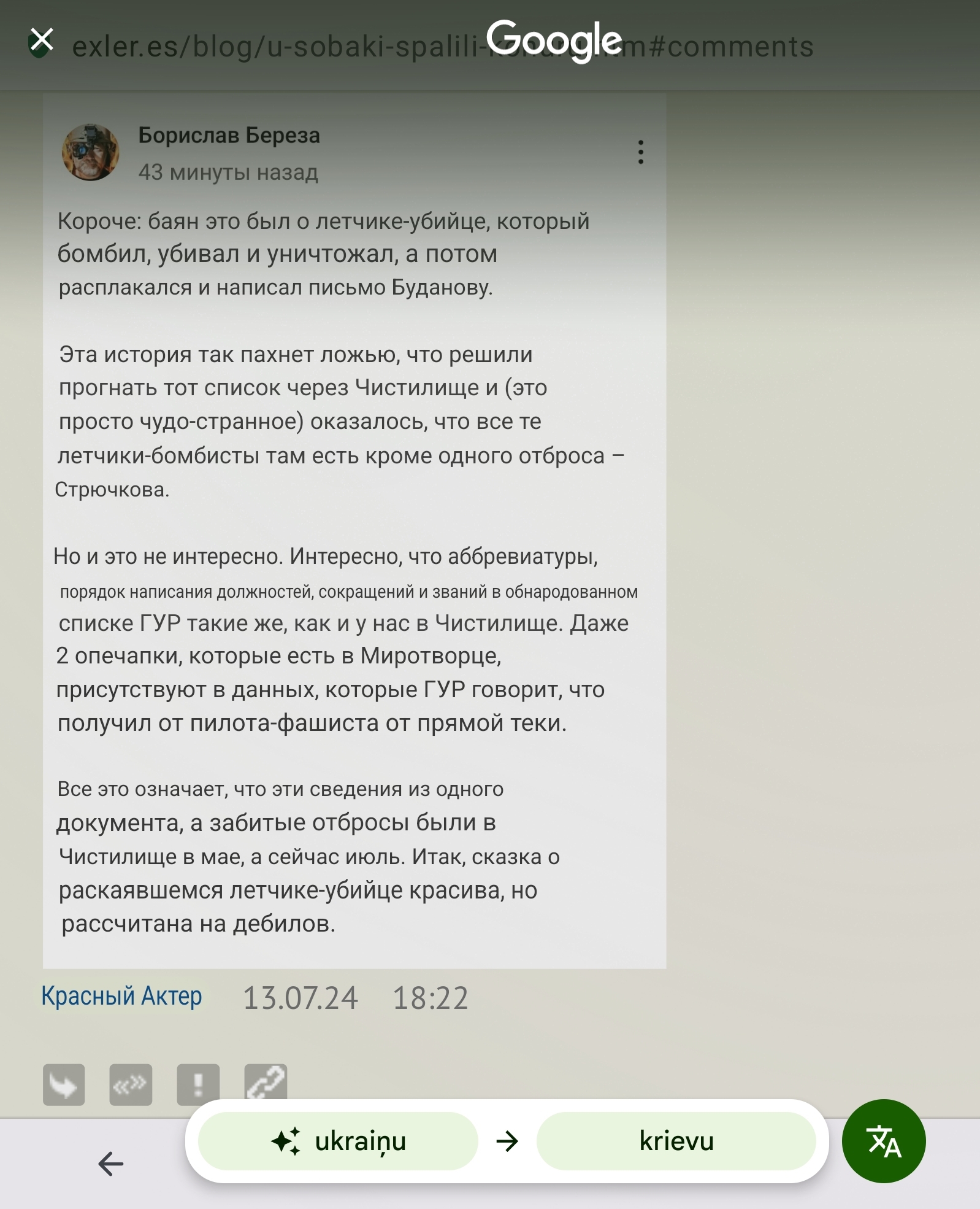 У тебя отменили Google Object? Сочувствую. Там и переводчик есть.Смысл товарищ сверху правильно передал. Все украинские СМИ и разные говоруны наперебой рассказывали про "раскаявшегося убийцу". Но что-то оказалось не так. Я вообще думал, что это наживка для чекистов - начать трясти летчиков, с кого звёздочки поснимать и себе перевесить. На нашлись дотошные правдорубы и все поломали.