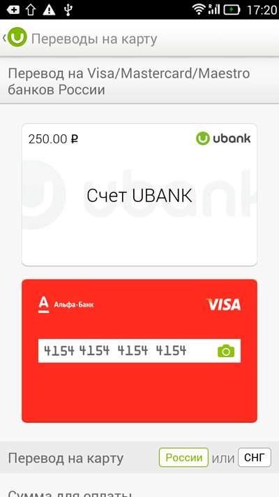 Если карта, на которую нужно сделать перевод, у вас под руками, то можно нажать на пиктограмму камеры и считать ее номер с помощью смартфона - работает железно, я несколько раз проверял.
