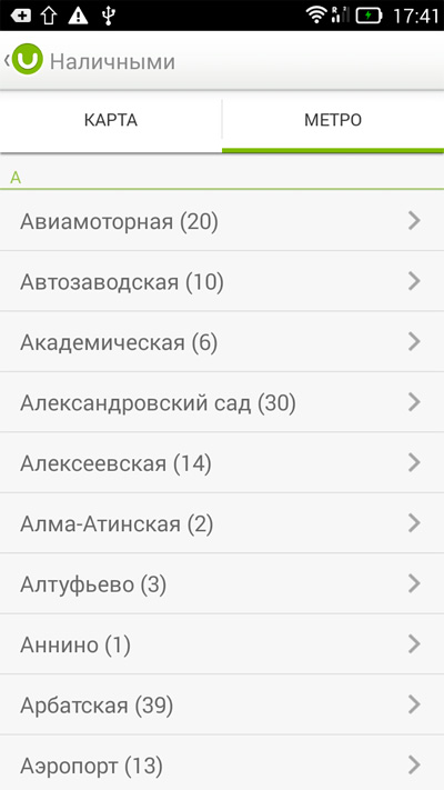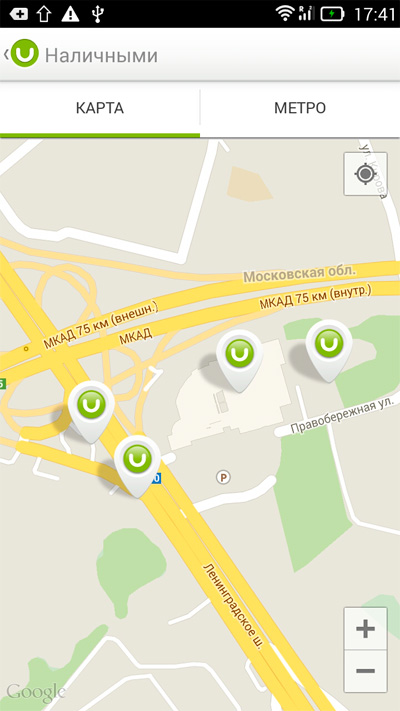Пополнять счет можно и наличными через специальные терминалы - система найдет такие терминалы поблизости и укажет станции метро, рядом с которыми они установлены.