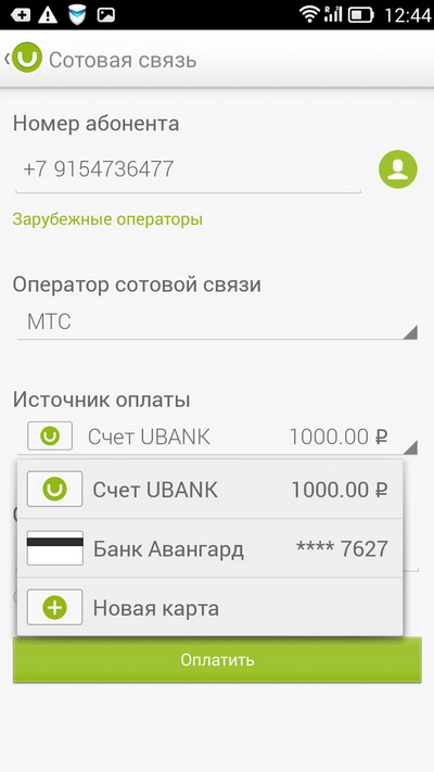 При оплате можно выбрать источник денег - привязанные карты или ваш счет в Ubank.