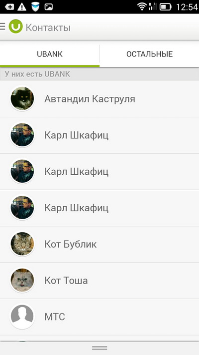 Также вам покажут всех абонентов, у которых установлен Ubank: вы сможете переводить им деньги прямо на их счета в Ubank, если будет такая необходимость.
