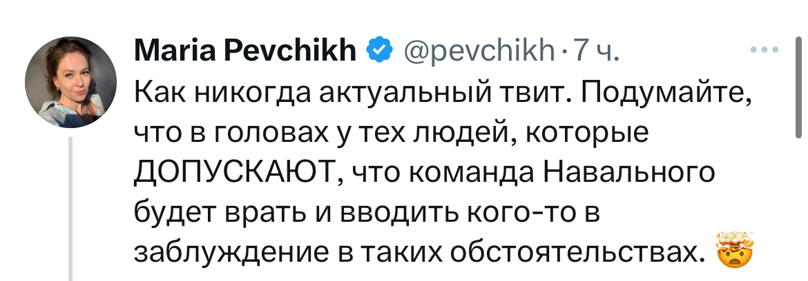 Честно говоря, надеюсь даже, что не права, и не такие вот попытки вытащить Навального в итоге склонили Путина к решению убить Навального (если что, Путина я, конечно, ни в каком случае не оправдываю).