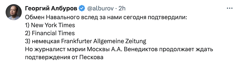 Мне тут вообще в упор ничего не понятно. Что значит "договорились об обмене"? Договорились об обмене Навального означает только одно - то, что эта договоренность была ЛИЧНО с Путиным и более ни с чем. Никто кроме Путина не мог пойти или не пойти на такой обмен. Что Путин действительно собирался менять кого-то на Красикова - да, он это заявлял в интервью Карлсону. Навального при этом он не упоминал.