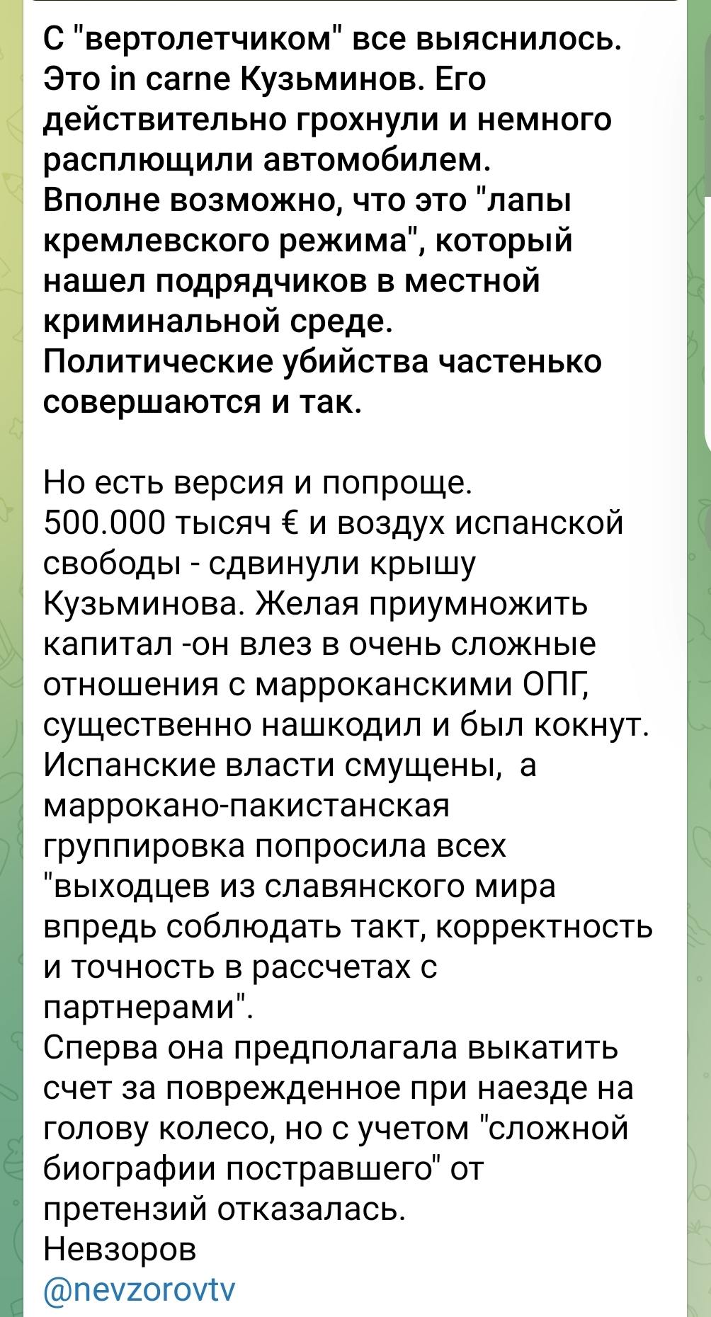 ♦️ГУР Украины обвинил российские спецслужбы в совершении убийства на территории Испании. Российские спецслужбы, в свою очередь, обвинили украинскую сторону в убийстве Кузьминова. Испанские власти и правоохранительные органы не делают никаких громких обвинений, следствие по делу продолжается.
