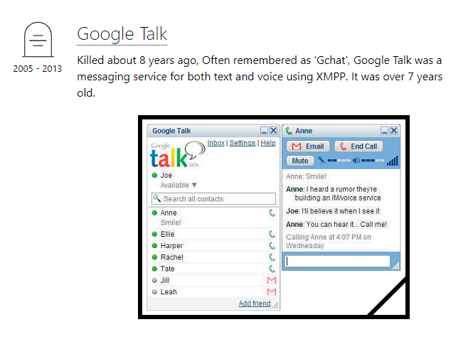 Talk вполне мог и уже почти вытащил Google на лидирующие позиции в мессенджерах, но попал под каток маркетологов: его решили пристрелить, принеся в жерву свежевыпущенному Hangouts, который от рожденья выглядел довольно монстроузно и даже в планах не имел виндового клиента, аналогичного Talk. Сервера авторизации GTalk отключили где-то в феврале 2015... Hangouts выключили в декабре 2020.