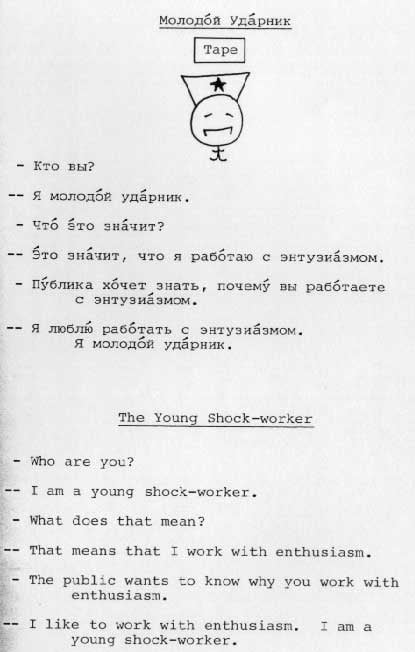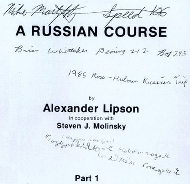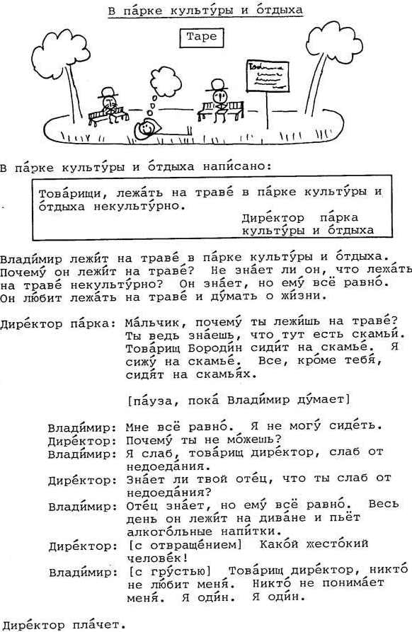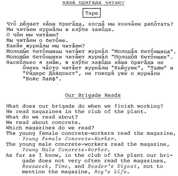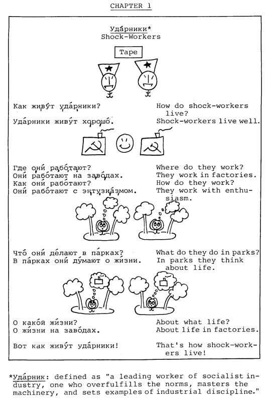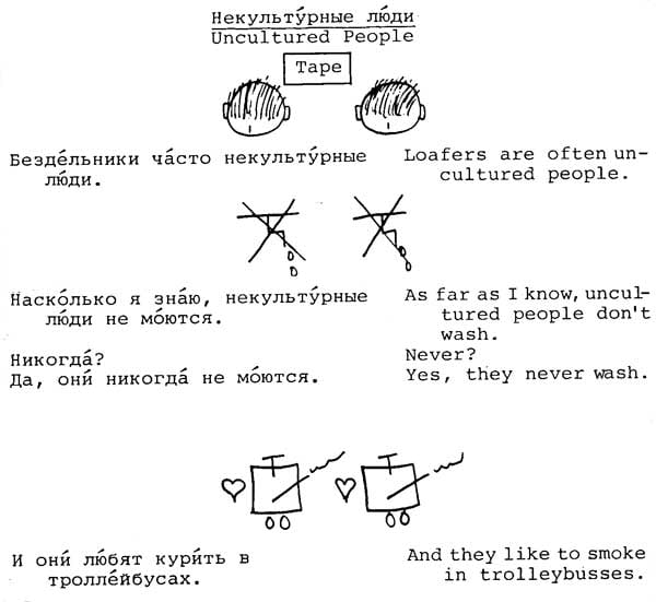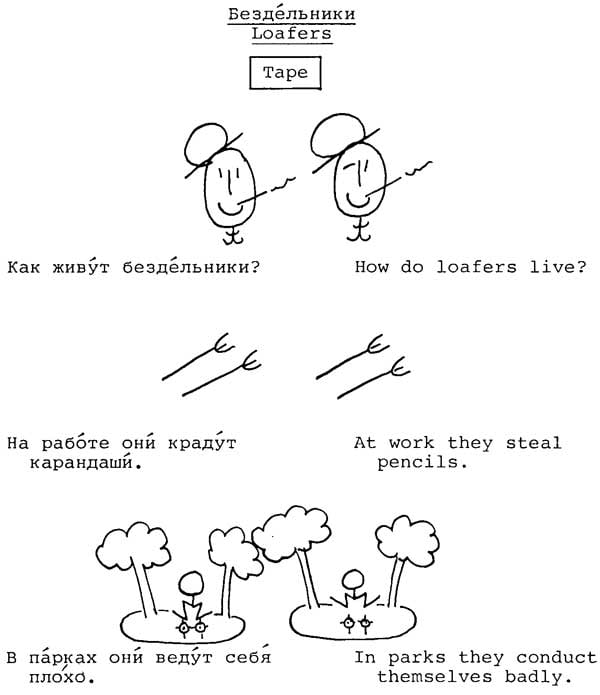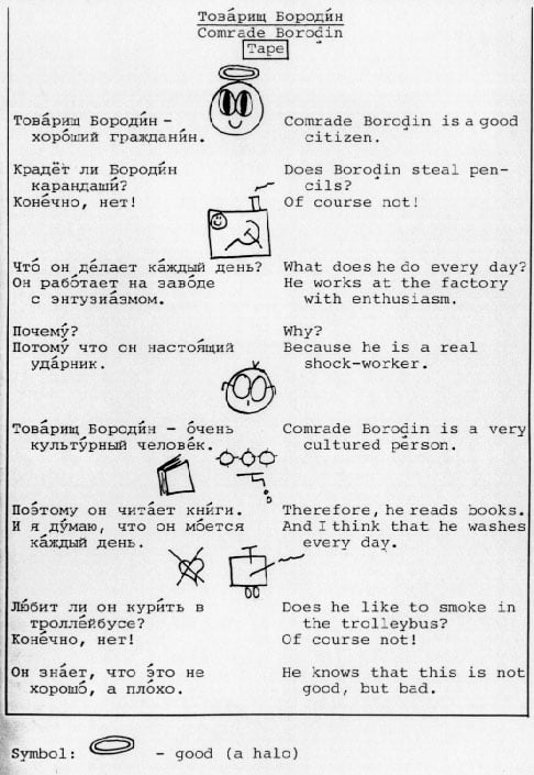 Мне попадалась пара страничек из этого учебника русского языка для американцев, но я думал, что это такой фейк. Однако нет, не фейк - это реально существующий учебник "A Russian course" Александра Липсона в сотрудничестве со Стивеном Джей Молински. Существует реально, и даже до сих пор продается на Амазоне за 30 долларов. Последняя редакция - 1981 года. У Ольги Арефьевой нашел несколько страниц из этого психоделического издания.