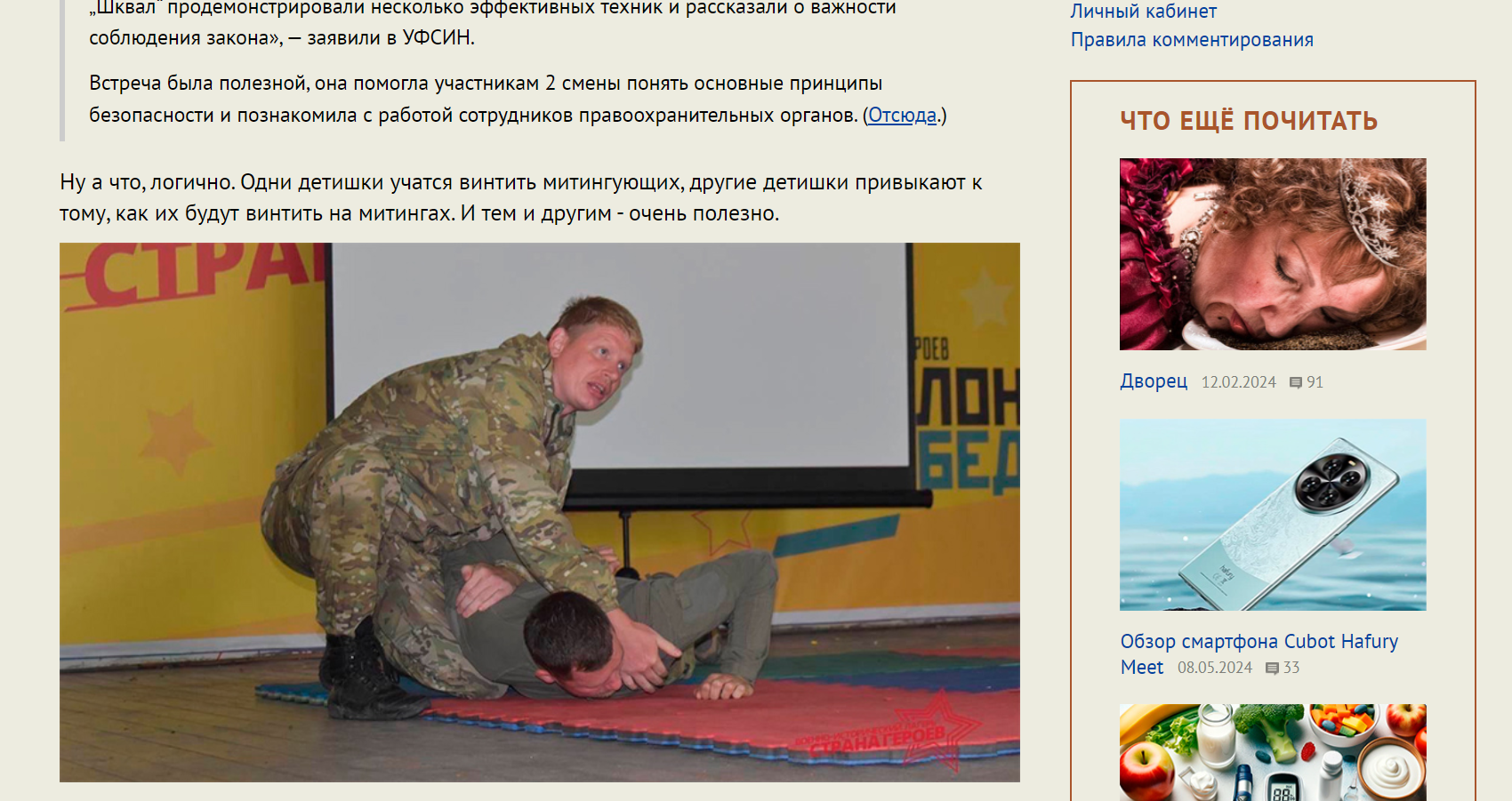 Также приемы разгона митингов показывали на церемонии посвящения в кадеты в Златоусте. Спецназовцы ФСИН наступали на воображаемую толпу с криками «Палкой бей» и синхронно выполняли соответствующие удары. Похожее мероприятие прошло в военной комендатуре Екатеринбурга для членов «Юнармии».