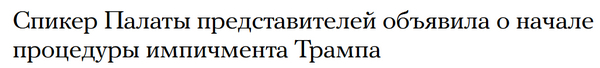 Импичмент уже произошел (и моя ставка УЖЕ сыграла). Пелоси объявила об этом официально и мы уже третий день живем в процессе официально начатой процедуры импичмента. И Трамп УЖЕ вошел в учебники по истории как президент, к которому БЫЛА применена процедура импичмента!
