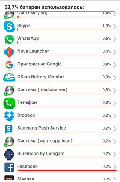 За 5 часов использования смартфона фейсбук не съел ничего и в список не попал, потому что он хоть и стоит, пользуюсь им крайне редко. А если буду гонять фейсбук и в хвост и гриву при 0% яркости, то конечно, процентов 40 съест за весь цикл. Но разве это косяк фейсбука, а не того, что для использования смартфона нужно питание?