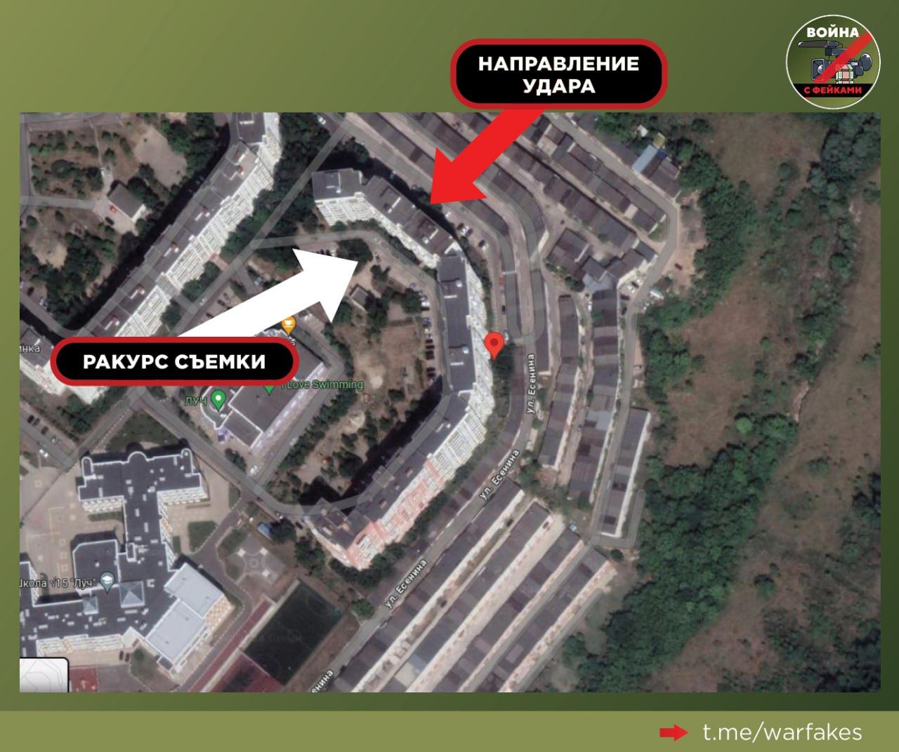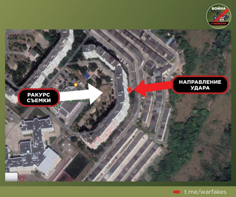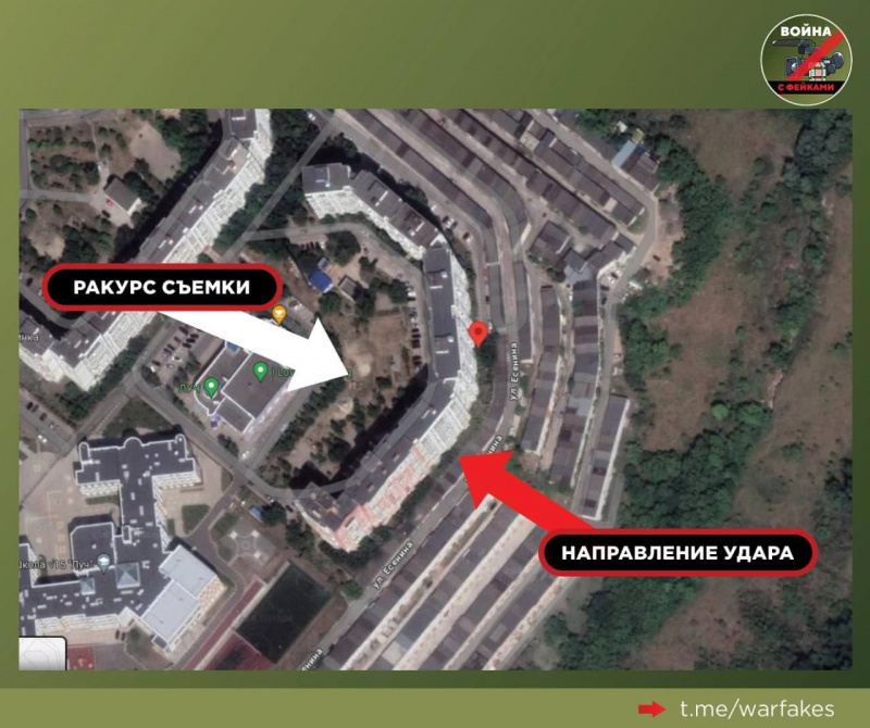 Но, видимо, поняв, что они совсем уж "махнули" с местом прилёта, ведь прекрасно видно, (https://t.me/ToBeOr_Official/15049) куда прилетело, они снова отредактировали картинку, указав теперь уже восточную сторону дома, что ближе к месту прилёта, но всё ещё можно выкрутить как будто прилёт был со стороны Украины.