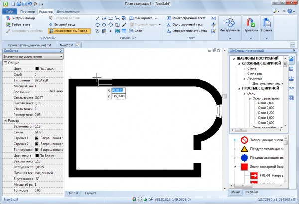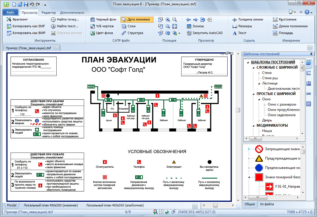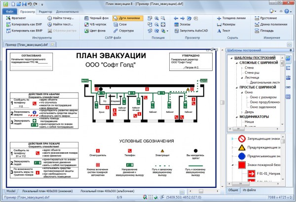Вычерчивать планы можно в любом масштабе, также не составит труда сопоставить все элементы и оформить конечный вид плана эвакуации. Кроме того, здесь не требуется дополнительная загрузка библиотеки знаков безопасности и символов, используемых на планах эвакуации: после установки программы все знаки доступны из панели "Шаблоны построений", и все они соответствуют требованиям ГОСТ Р 12.4.026.