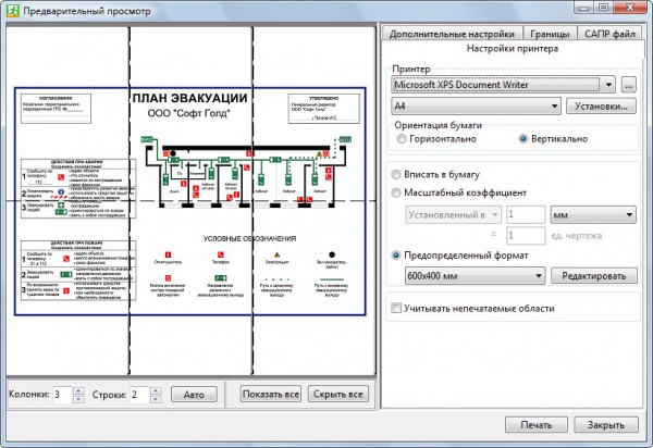 В программе можно выбрать формат бумаги по ГОСТ Р 12.2.143-2009 - 400 на 600 мм или стандартные инженерные форматы А2, А3, А4 и так далее.