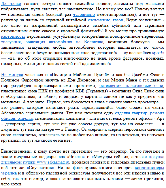 Искал информацию по фильму "Полиция Майями". Набрел по ссылке на так называемый "русскоязычный сайт фильма" (ссылку давать не буду по вполне понятным причинам). Сайт - одна страничка, на которой выложена рецензия, спертая с "Кинокадра". В текст рецензии "искусно" вплетается ссылочная реклама. Зрелище - совершенно психоделическое. Полюбуйтесь (даю графическим куском, ссылки, разумеется, не нажимаются):