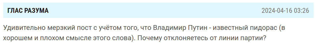 ЛГБТ-сообщество в Российской Федерации на законодательном уровне признано экстремистской организацией, запрещена пропаганда этого отклонения от традиционных ценностей среди молодёжи. Однако, к нашему стыду, в трансляциях волейбольных матчей крупным планом демонстрируются чудовищные жесты, имитирующие половой акт в исполнении игроков калининградского «Локомотива», направленные в сторону команд соперников, однополые поцелуи в губы и прочие мерзости.