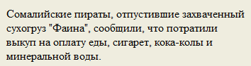 мне в сообщении корреспондент.нет понравилась фраза ЗАЕМНЫХ ДЕНЕГ!!! То есть ребята целевой кредит взяли на захват фаины что ли? у сомалийских банков новая статься доходов похоже: возьми кредит в национальном банке сомали под минимальные проценты и уже завтра мы сможешь захватить арабский супертанкер на собственной пласмассовой лодке.