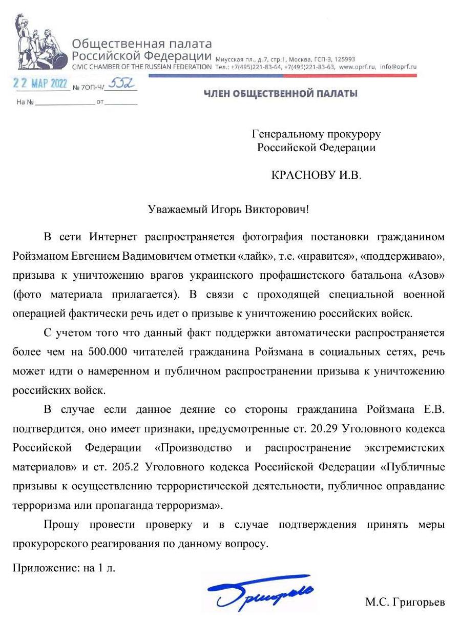 Некий Григорьев из российской общественной палатки это заметил и уже накатал донос в прокуратуру.