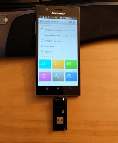 По внешнему виду легко догадаться, как она работает. В обычный компьютер (ноутбук) она вставляется разъемом USB и на нее (с нее) можно перекачивать файлы, у нее есть своя память в 16, 32 или 64 Гб. В смартфон-планшет она вставляется разъемом microUSB - и на нее (с нее) можно перекачивать файлы. На сайте разработчика представлен список совместимых устройств, но она у меня заработала абсолютно на всех смартфонах и планшетах, находящихся дома, а у меня их реально немало. Причем в списке совместимых был только один смартфон из имеющихся.