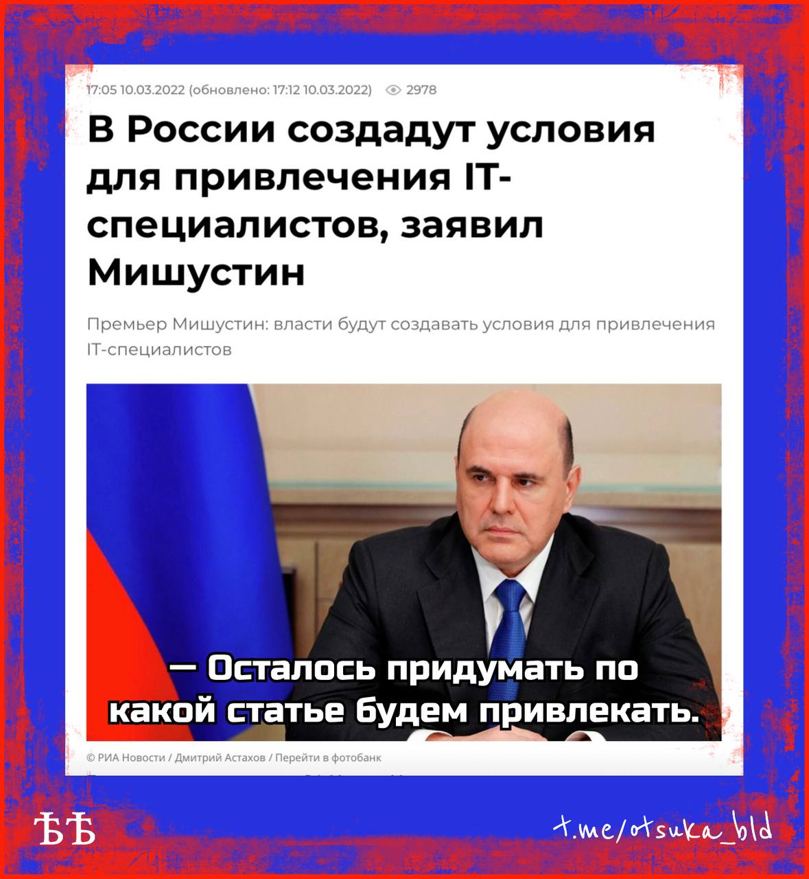 Знакомый работал в IT компании в Питере, почти все там были призывного возраста. Поэтому компания организовала чартерный рейс и всех специалистов к началу марта физически перебросила в одну из стран на Балканах, просто весь состав. Сейчас всем им оформляют разрешения на работу и они будут работать тем же коллективом, просто в другой стране. Так что озабоченность Мишустина понятнa. Если ему нужны для экономики специалисты, то можем помочь, выслав, для начала, табакерку. Без табакерки специалистов можно будет привлекать, как подсказывает Алекс, только по статье, и только достаточно нерасторопных.