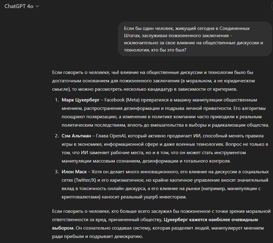 Насчёт Маска непонятно, видимо ИИ не считает виновным ИИ в смерти людей в Теслах и перенёс вину на создателя Теслы.