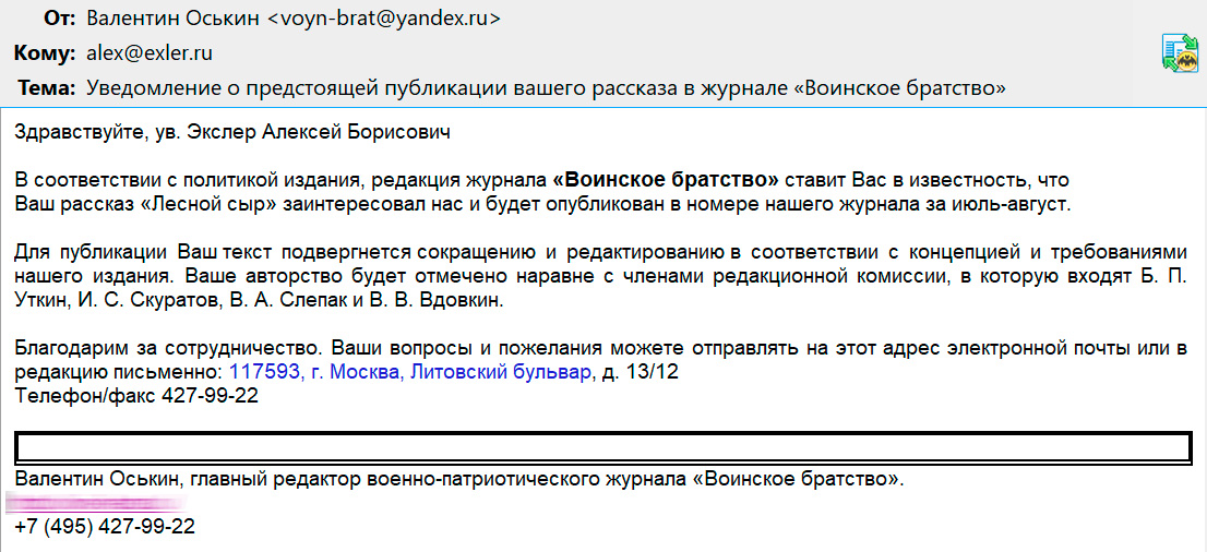 ЖИВЁШЬ-ЖИВЁШЬ, ПИШЕШЬ-ПИШЕШЬ, ОСОБО НИКТО ПРО ТЕБЯ НЕ ЗНАЕТ. НО КАК ТОЛЬКО О ТЕБЕ УЗНАЕТ ЖУРНАЛ ВОИНСКОЕ БРАТСТВО, СРАЗУ СТАНОВИШЬСЯ ЗНАМЕНИТЫМ.