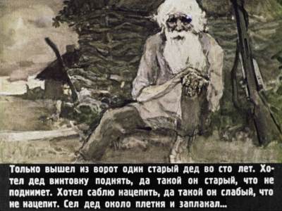 "вышел из ворот один старый дед во сто лет. Хотел дед винтовку поднять, да такой он старый, что не поднимет. Хотел дед саблю нацепить, да такой он слабый, что не нацепит. Сел тогда дед на завалинку, опустил голову и заплакал."