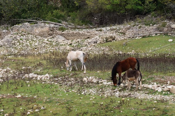На берегу паслись лошади - первый раз в жизни увидел мула. Вон он, совсем маленький, рядом с гнедой лошадью.