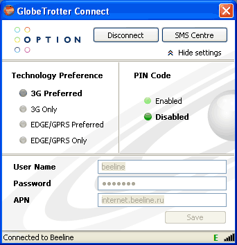 После этого остается только перезагрузить машину. После загрузки в системной области уведомлений появится значок, при щелчке по которому возникает окно специальной программы соединения с Интернетом. Все настройки там были прописаны автоматически - осталось только нажать кнопку Connect.