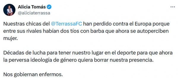 Наши девушки из @TerrassaFC  проиграли в матче с «Европой», потому что среди их соперников было двое бородатых мужчин, которые теперь считают себя женщинами.
