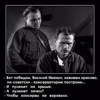 - Вот победим, Петька, понастроим везде консерваторий, чтобы консервов всем хватало!