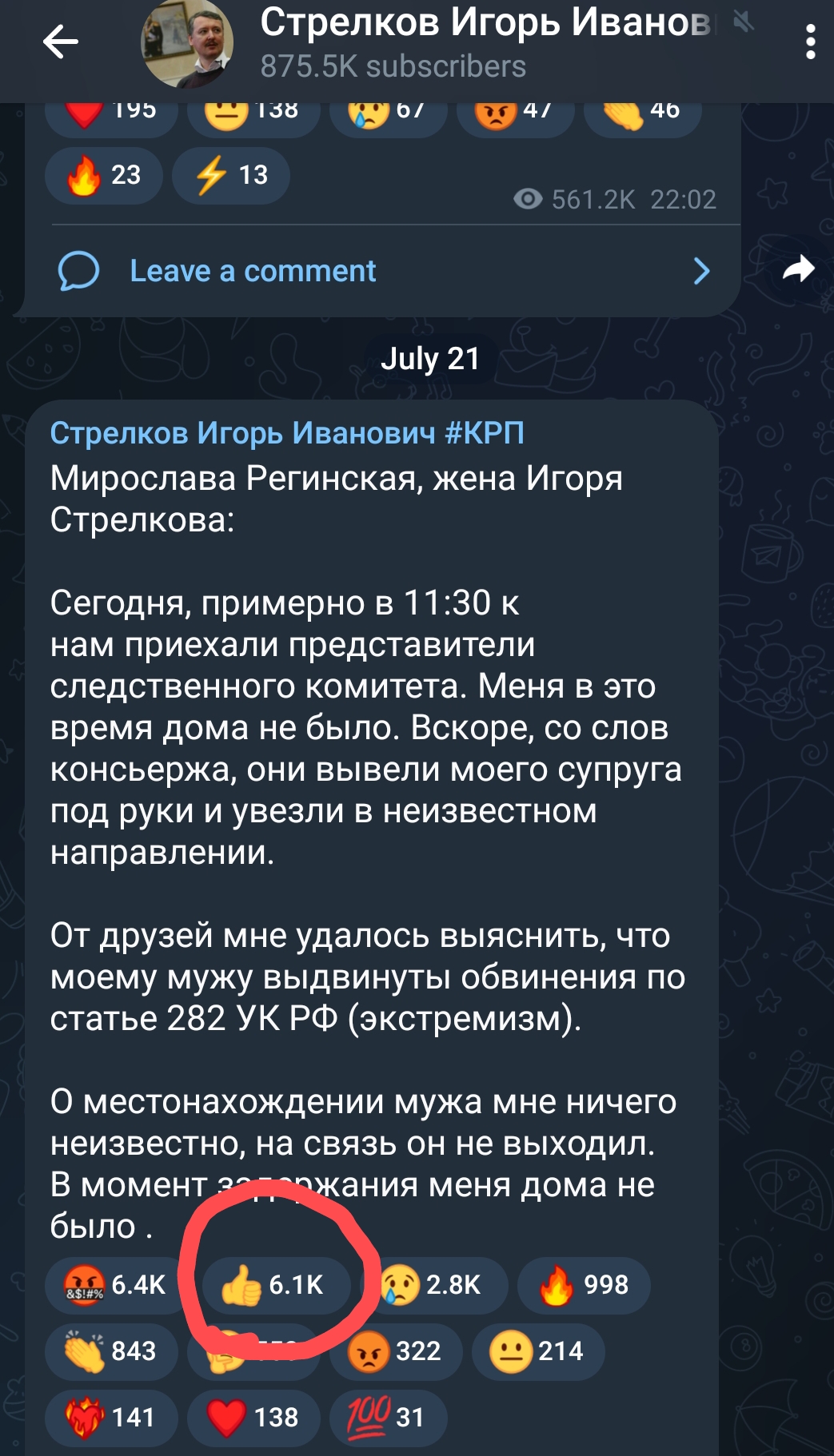 В Telegram Стрелкова появилось сообщение его жены Мирославы Регинской. Она сообщила, что отсутствовала дома, когда туда приехали представители Следственного комитета. Со слов консьержа она написала, что Стрелкова вывели из дома под руки.