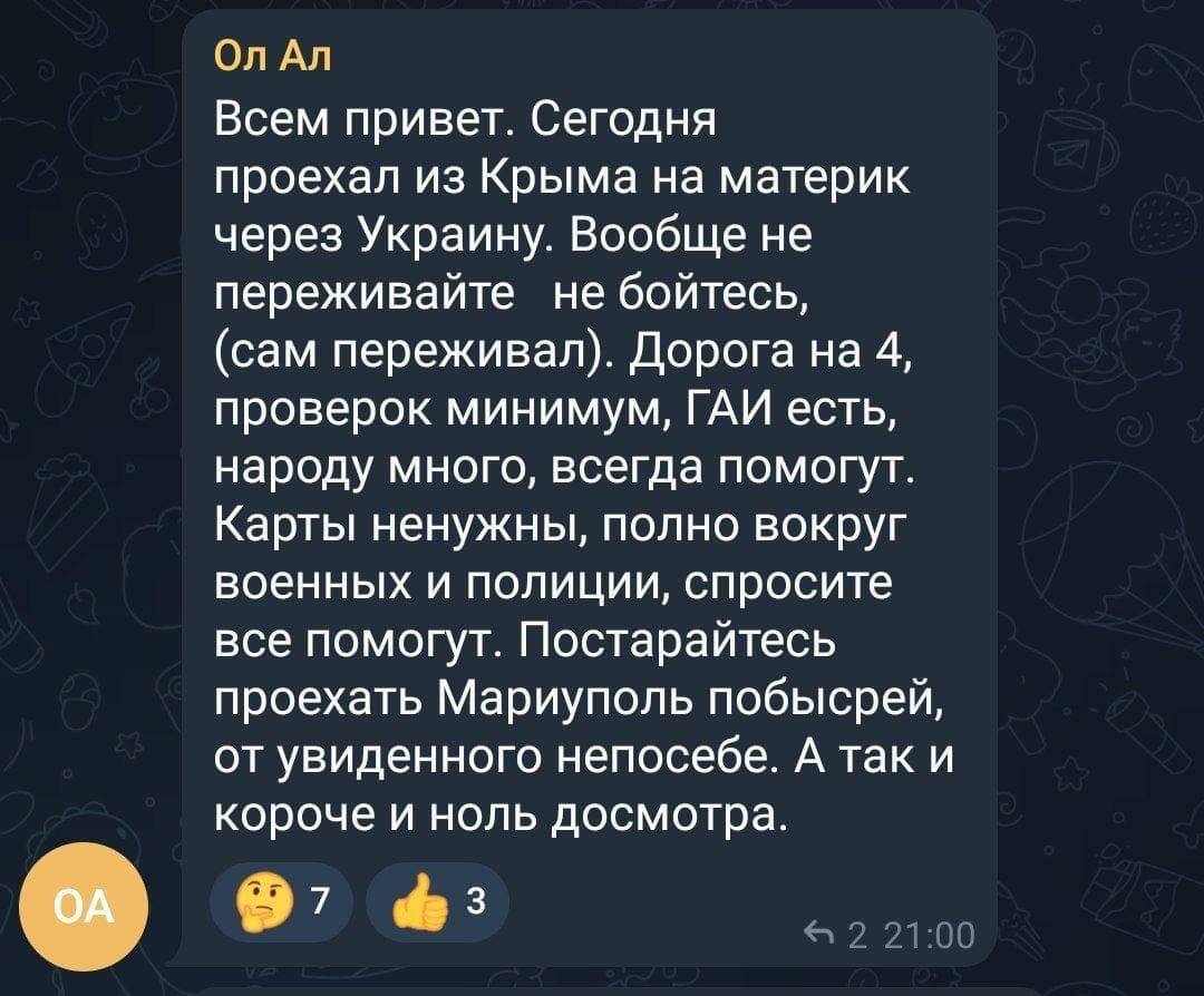 Выезжали через Джанкой – Мелитополь, а там дороги ещё не достроили и пробки были от одного только строительства. Вообще, дороги от Украины достались в советском состоянии, мы от такого отвыкли даже в Крыму. А тут ещё весь поток с Моста и половина с Порта добавилась.