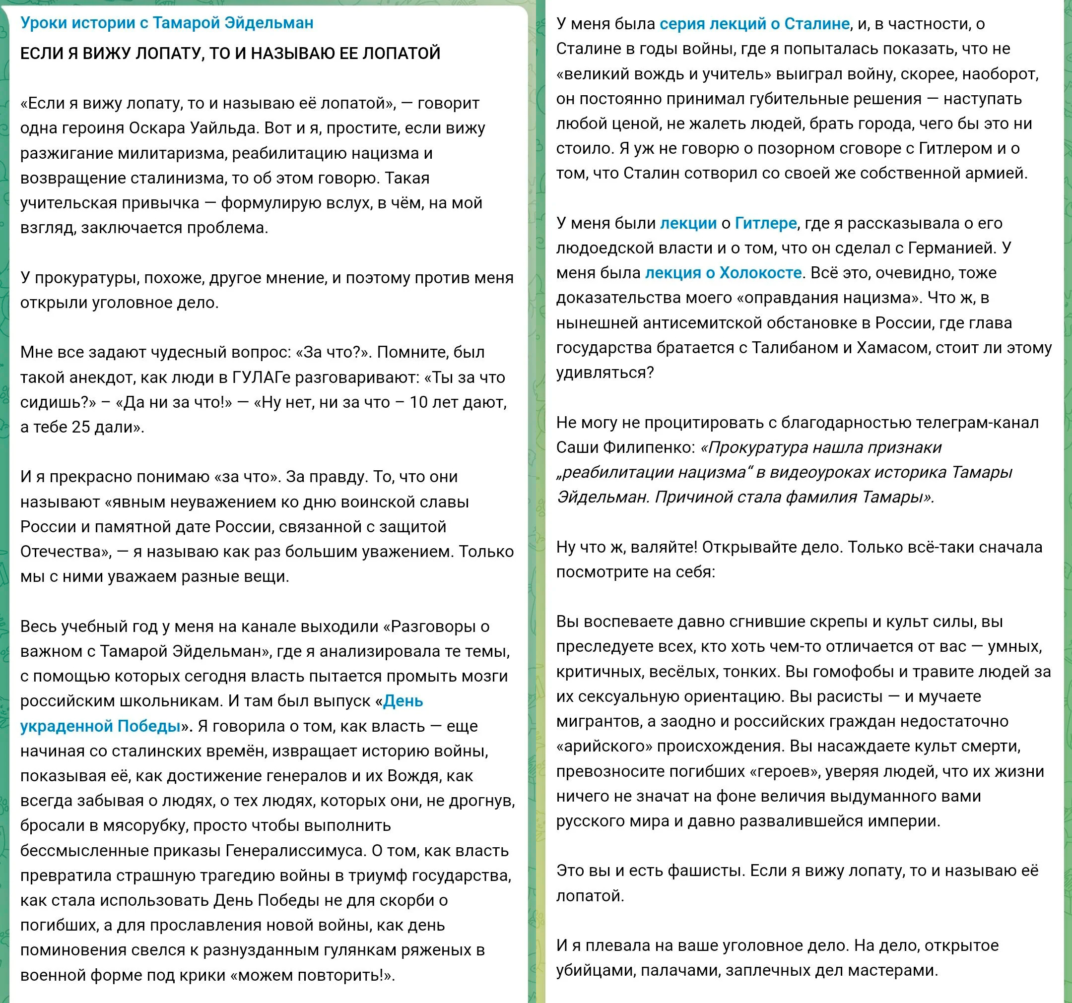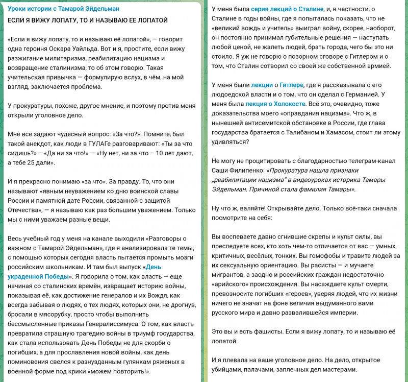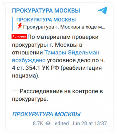 Против замечательной Тамары Эйдельман (очень рекомендую ее YouTube-канал, у которого 1,66 млн подписчиков, также у нее есть очень интересный телеграм-канал "Уроки истории с Тамарой Эйдельман") в прокуратуре РФ возбудили уголовное дело по статье о "реабилитации нацизма".