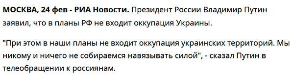 В заявлении от 24 февраля. Когда началась полномасштабная война в Украине, которую Путин упорно войной до сих пор не называет. Но у него вообще всегда черное - это белое, а белое - это черное.