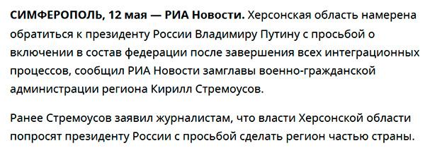 "Накануне Стремоусов заявил, что власти Херсонской области собираются обратиться к Владимиру Путину с просьбой включить регион в состав России. Он пояснил, что референдум по этому вопросу проводить не планируется, так как мировое сообщество все равно не признает его итоги. Как заявил пресс-секретарь российского лидера Дмитрий Песков, комментируя заявление Стремоусова, определять будущее Херсонской области в любом случае будут ее жители..."