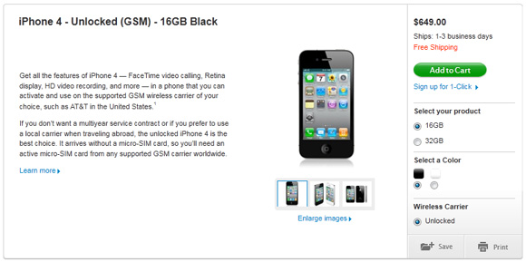 Это... с самого начала было можно. Я ещё прошлым летом привозил из США в Питер 2 незалоченных iPhone 4, купленных лично мной в фирменном магазине Apple. Другое дело, что чтобы это найти, нужно было спуститься в самый-самый низ официальной страницы iPhone 4 и прочитать примечание нонпарелью. В подарок можно было купить незалоченный, в подарок. Или в другую страну. И цена, помню, была 599 за 16 Гб (без налогов). Так что, новость немножко запоздала. 😉