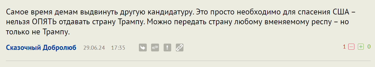 Но беда в том, что Трамп может выиграть сейчас совершенно честно (как некогда и тот-чьё-имя-нельзя-называть). Слишком уж слабый противник Байден сейчас (по сравнению с хамливым и лживым, но эффективно-нахрапистым Трампом). Срочно нужно менять кандидата.