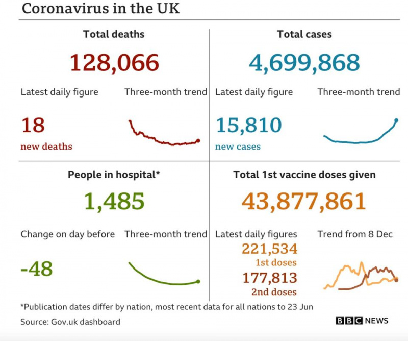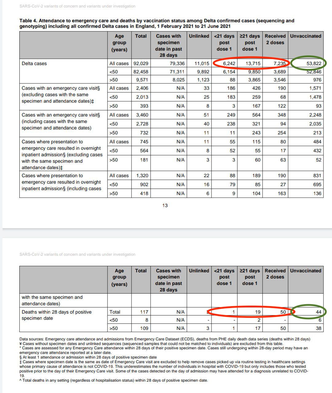 Самое поразительное, что ВВС называет это доказательством эффективности вакцин и даже озаглавило подзаголовок так: Vaccines are working well against Delta ("Вакцины хорошо работают против Дельты"). Однако статистика показывает прямо противоположное. Так, среди госпитализированных с дельта-вариантом в период с 1 февраля по 14 июня 2021 года (всего 806 человек) 65% не были вакцинированы, 17% - одной дозой минимум за три недели до госпитализации, 10% - двумя дозами минимум за две недели до госпитализации. Еще 8% в этой статистике куда-то потерялись.