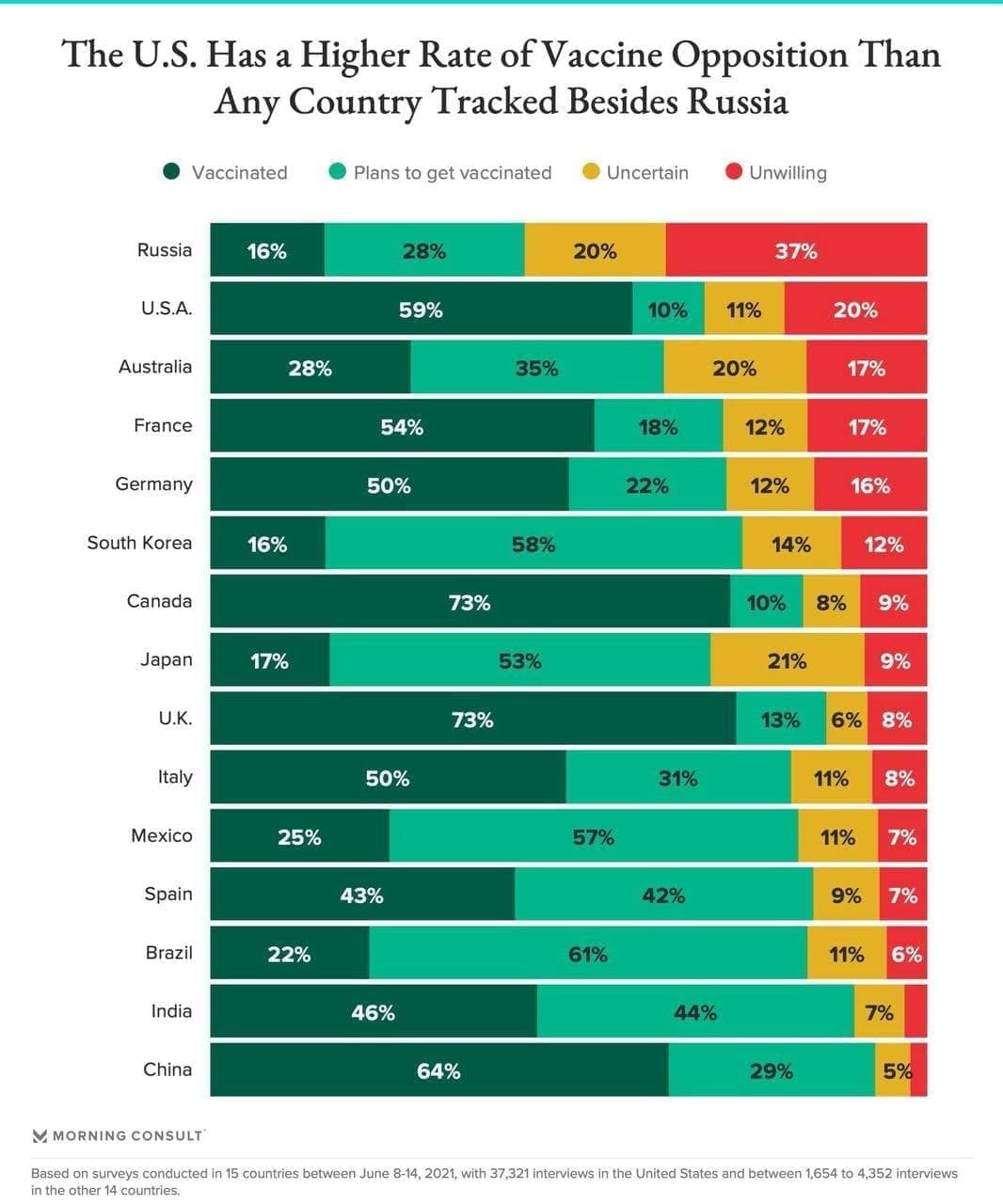 Вот статистика. 20% не уверены. 37% отказываются, но далеко не все из них рьяные антиваксеры.