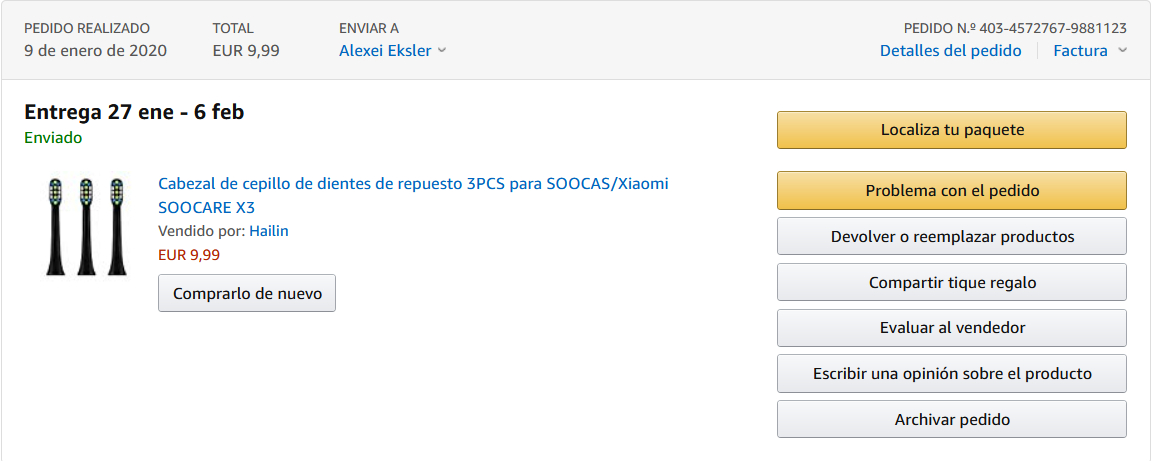 Надо было заказать головки для моей зубной щетки Xiaomi Soocare X3 (их полагается менять не реже раза в три месяца). А я все долго прособирался, уже пора было менять, решил заказать на Амазоне, чтобы не ждать долго с Aliexpress. Нашел, заказал. Правда, написали, что приедет не очень быстро. Ну ладно, подождем.