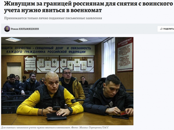 При всей дикости нынешнего времени в этом заголовке нет ничего нового: уже много лет как при длительном выезде за границу (учёба, работа, эмиграция и т п), нужно лично придти в военкомат и сняться с учета. А вернувшись - встать на учёт.