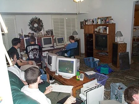 Несколько раз устраивали такие лан-пати на даче у товарища, правда уже в более поздние времена, когда у всех появились хоть какие-то ноутбуки, наверно где-то в конце 10-х. Резались в Квейк 3, Старкрафт и Каэсочку.