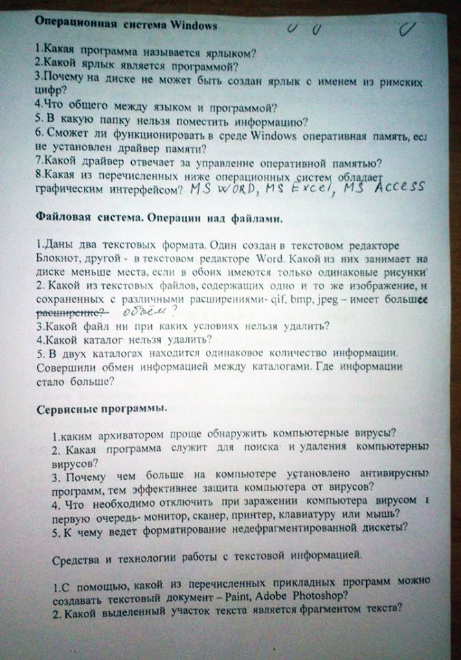 Бред-не бред, но вопросник-то годный. Позволяет сразу определить - насколько чел знаком не только с теорией, но и с практикой. Помните ж анекдот: блондинка нанимается на работу секретаршей. Её спрашивают – «с какой скоростью печатаете?» Она – «300 знаков в минуту. Правда, такая ерунда получается». Так же и тут - чел может вызубрить учебник, верно ответить на "правильный тест", но - допусти его к компу - "такая ерунда получится".
