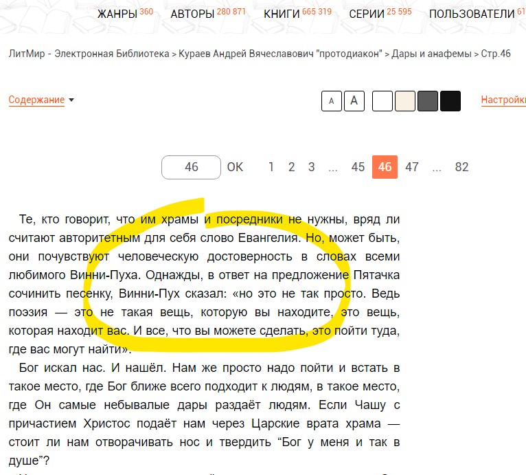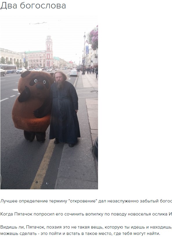 Пафнутий, вы упёртый, но тут другая тема. Винни-Пуха Кураев, конечно, не придумал, но использовать именно этот эпизод для православной апологетики придумал именно он. Вначале я нашел это рассуждение в его ЖЖ за 17-й год, но затем в целом ряде прежних интервью, пока не добрался до старой книжки, где он, возможно, эту проповедь огласил впервые. Авторство и новизна не в диалоге Винни с Пятачком, а в том, что этот диалог использован для иллюстрации отношений человека, Бога и церкви. Кураеву идея нравилась, он ее повторял чуть ли не в любом своем выступлении (поэтому я и написал, что "самоповтор"), вот и провинциальному священнику она тоже понравилась - ему, очевидно, стиль Кураева симпатичен. Это совершенно нормально, похвально и никто никого в плагиате не обвиняет, не тот случай.