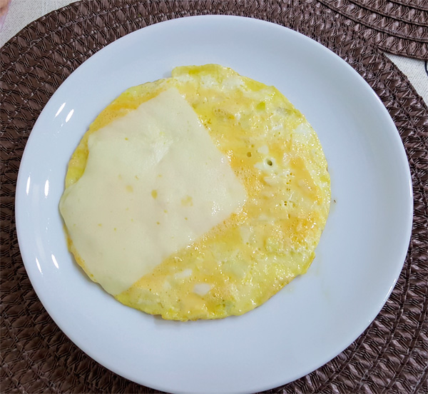 В результате сделал, как обычно: взбить два яйца, добавить туда чуть-чуть мелко порезанного репчатого лука, посолить, вылить на сковороду и готовить, не перемешивая (а то получится типичный отельный омлет, который мне жутко надоел), на среднем огне до готовности. Примерно в середине приготовления положить туда тоненький кусочек сыра, который должен слегка растаять от чувств-с.